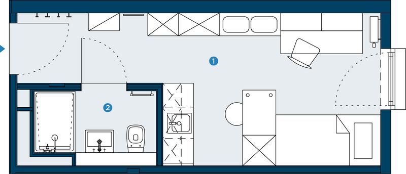 Praktisch geschnittenes, voll möbliertes Einraumapartment mit …