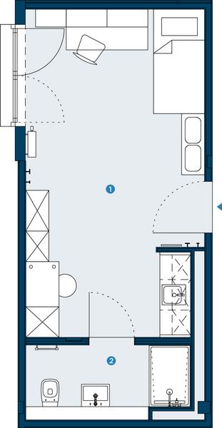 Praktisch geschnittenes, voll möbliertes Einraumapartment mit …