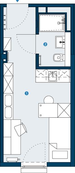 Praktisch geschnittenes, voll möbliertes Einraumapartment mit …